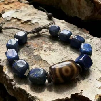 A hand-crafted insight bracelet featuring a Three-Eye Dzi bead paired with natural lapis lazuli beads. Designed to support clarity, wisdom, and balanced perception through ancient symbolic resonance.