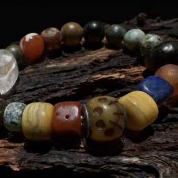 An antique 108-bead mala retrieved from the Tibetan highlands, enriched with black camel bone inlay....
