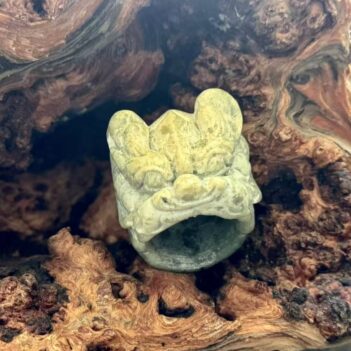 A one-of-a-kind thumb ring hand-carved from natural jade into a powerful lion head. Symbolizing cour...