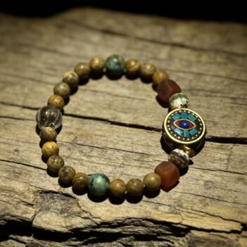 A Tibetan handmade energy bracelet centered on a one-line Healer’s Dzi bead, paired with natural turquoise, red agate, picture jasper, and 925 silver. Each element carries sacred energy — awakening insight, restoring balance, and grounding the spirit in calm strength. Handcrafted by Nepali artisans, it serves as a vessel of healing and spiritual protection.